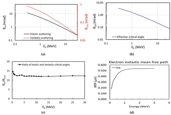 θinel. These angles depend on the electron energy, and they can be obtained by numerically integrating the differential cross-sections (Equations (1) and (3)) azimuthally [
