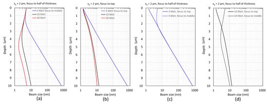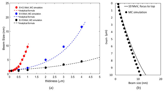 , e.g., 1 μm for the 300 keV case, a few microns for the beam energies of 3 MeV and 10 MeV. Moreover, we compare the beam size estimated via analytical formula (Equations (7)–(9)) and simulated via MC code up to 10 μm thickness with the optimal electron energy of 10 MeV. There is a reasonably good agreement between the analytical prediction (solid line) and MC simulation (circles) with the sample thickness in the range of 0 to 8 μm, as shown in