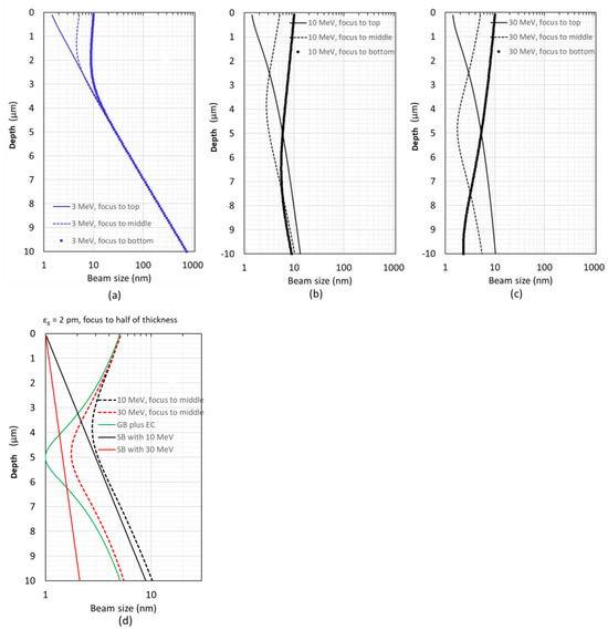 Figure 2a,b with the probe beam focused on the middle and top of the sample, respectively. For the 3 MeV case, the resolution is dominated by the SB; once the sample thickness exceeds 2 μm (