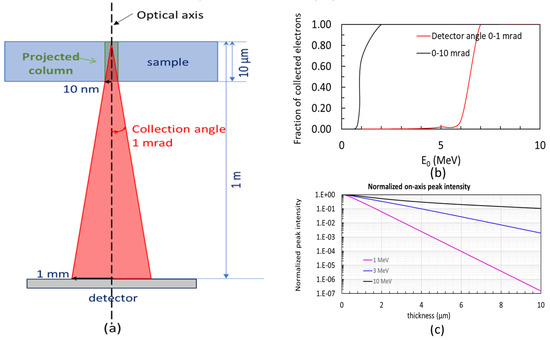 c). However, fully understanding the multiple elastic and inelastic scatterings, lateral intensity distribution, and achievable spatial resolution for large, thick biological samples up to 10 μm in thickness is a highly scientific challenge that requires significant resources and commitment. It is worth noting that these analytical formulas may be subject to limitations due to the above assumptions (e.g., sample thickness up to 10 μm and high electron energy exceeding several MeV), and an in-depth study of these complexities is beyond the scope of this paper.