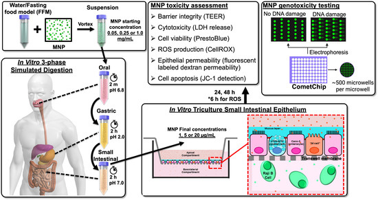 Recent toxicity studies have investigated genotoxic stress and DNA damage caused by MNP particles via the traditional comet assay in different intestinal cell line models, including Caco-2, HT29-MTX, Raji B, and Caco-2/HT29-MTX/Raji B tricultures [42,43,44]. Results from these studies showed that genotoxic effects of MNPs were greatly dependent on MNP physicochemical characteristics and exposure concentrations and durations. However, our understanding of MNP genotoxicity remains limited and incomplete, particularly for low-concentration and long-term exposures to environmentally relevant MNPs that humans might encounter in real-world situations. Moreover, in previous studies of MNP genotoxicity in intestinal models, cells were directly exposed to MNPs suspended in cell culture media, ignoring the role of biotransformations that would occur during human digestion process (e.g., surface chemistry changes and biocorona formation) prior to contact of the MNPs with intestinal cells, which are known to have important impacts on ingested particle biointeractions [45]. In addition, the traditional genotoxicity testing methods employed in these studies have been reported to exhibit low sensitivity and efficacy, as well as inconsistency and susceptibility to user bias [46].