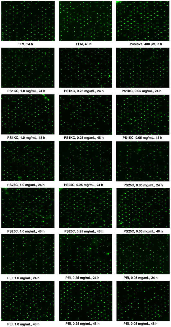Image data depicting MNP-mediated DNA damage in the triculture SIE model using the CometChip assay are shown in Figure 3. The H2O2-treated positive control group demonstrated significantly larger comet tails, whereas FFM, PS25C, PS1KC, and PEI PM0.1-treated groups presented varying increases in comet tail size compared to controls.