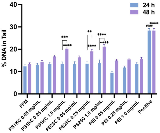 The % DNA in Tail values, which provide quantitative assessment of DNA damage, including DNA strand breaks and alkali-labile sites, are shown in Figure 4. DNA damage (% DNA in Tail) was significantly increased after 48 h exposures to digestas of 0.25 and 1.0 mg/mL PS25C and of 1.0 mg/mL PS1KC compared to controls and 24 h exposure groups. Moreover, PS25C and PS1KC produced concentration-dependent increases in the % DNA in Tail after 48 h exposure. However, exposures to PEI PM0.1 digestas had no significant effects on DNA damage relative to controls at any exposure concentration or duration. Together these results indicate MNP-dependent effects, with exposure to digestas of carboxylated PS but not of PEI MNPs inducing DNA damage in a time- and concentration-dependent manner.