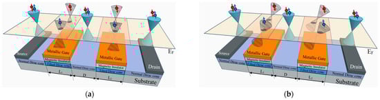 The refractive angle is determined by considering the translational symmetry in the y-direction, where the wave vector parallel to the y-axis remains conserved. For simplification, both barriers have the same exchange field tuning with the same gate voltage and . After substituting into Equation (7), we obtain the x-component of the wave vector for the particle inside TDC1 and TDC2 as