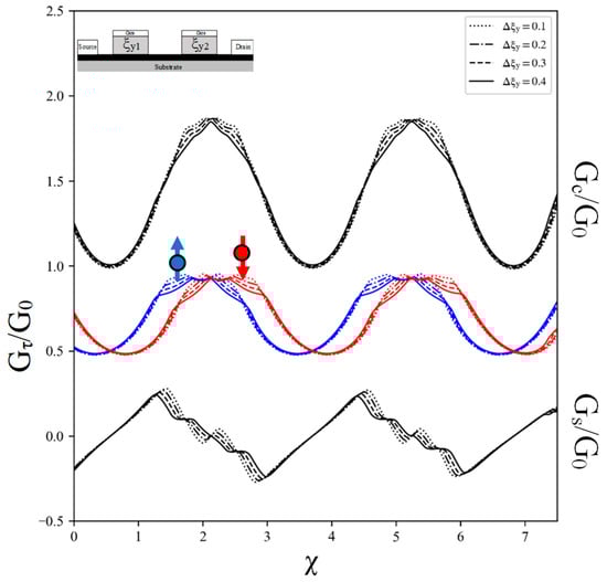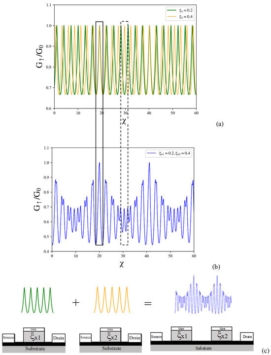 In Figure 6b, a distinct quantum beating pattern is depicted in the spin-resolved conductance, revealing an intriguing phenomenon. This behavior emerges from the superposition of two oscillating conductances within the asymmetric LTDC, as shown in Figure 6a. These spin-resolved quantum beats offer valuable insights into the complex dynamics of spin-resolved conductance, particularly in the presence of an asymmetric mismatched LTDC. To achieve a comprehensive understanding of the oscillating characteristic of spin-resolved quantum beats in the presence of the asymmetric mismatch LTDC, the oscillations in spin-resolved conductance can be precisely described by a cosine function.