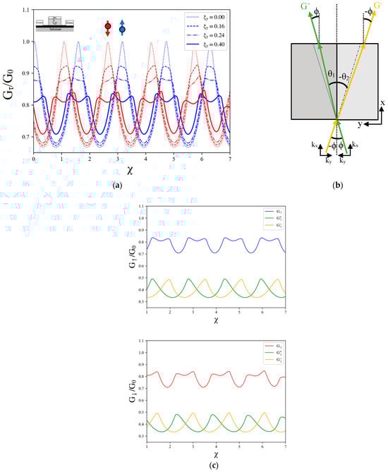 In this study, we focus on the oscillatory characteristic of spin-resolved conductance in the presence of a TTDC within asymmetric tilted velocity barriers. The TTDC is characterized by a tilted velocity , as depicted in Figure 1a. Our investigation begins with the analysis of spin-resolved conductance oscillation behavior in the context of an asymmetric TTDC. The results, as shown in Figure 3, reveal an oscillatory behavior in spin-resolved conductance, and . The presence of an asymmetric TTDC coupled with an exchange field results in a phase shift in the oscillation behaviors of spin-resolved conductance.