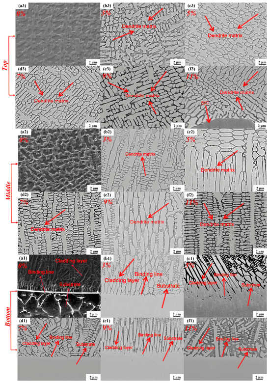 The metallographic microstructure images of the cladding layer with 0 wt% SiC, as shown in Figure 5(a1–a3), demonstrate that the microstructure predominantly comprises flocculent dendrites, columnar crystals, equiaxed crystals, cellular crystals and inter-dendritic regions. Notably, the majority of the crystal structures near the bonding zone between the substrate and the cladding layer are significantly larger than those located farther from this zone. This observed phenomenon can be attributed to the laser cladding process, during which the metal powder alloy attains a molten state at the center of the melt pool. The portion in contact with the substrate cools first, resulting in convection and diffusion phenomena between the bonding zone and the substrate. Consequently, the temperature gradient decreases from the bonding zone to the top of the cladding layer, which leads to a considerably faster growth rate of crystallites in comparison to the rate of nucleation.