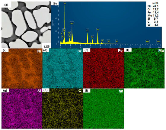 EDS mapping of 9 wt% SiC melting surface. (a) EDS mapping of the overall area; (b) overall elemental spectra of EDS mapping; (c–i) EDS mapping, elemental distribution of Ni, Cr, Fe, Si, C, W.