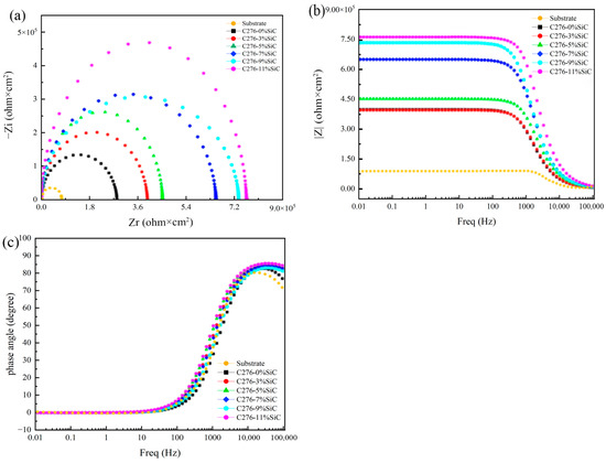 The electrochemical AC impedance mapping curves of the C276-SiC cladded coatings, featuring varying SiC additions in a 3.5 wt% NaCl corrosion solution, are presented in Figure 14. The overall test frequency domain for the EIS mapping ranges from 10⁻2 Hz to 105 Hz. Figure 15a illustrates the Nyquist mapping of the C276-SiC cladded coatings with different SiC additions, revealing that the shape of the plot comprises semicircular capacitance arcs. As the amount of SiC addition increases, the diffusivity of SiC powder particles within the cladded coating also rises. This enhancement refines the grain size and inhibits the growth of the crystal structure, resulting in a densely distributed microstructure throughout the cladded coating. Additionally, the increased diffusivity of SiC powder particles promotes the formation of an oxide film, which contributes to corrosion resistance. An increase in SiC quantity correlates with a rise in the radius of curvature of the capacitive arc in the EIS diagram. The Bode impedance modulus of the cladded coatings with varying SiC additions is depicted in Figure 15b, while the Bode phase angle for the cladded coating with different SiC additions is shown in Figure 15c. The Bode modulus diagram indicates that the EIS modulus value gradually declines with an increase in frequency. However, when the scanning frequency exceeds 1000 Hz, the Bode modulus value reaches a plateau stage of slow decline, corresponding to the regions adjacent to the larger radius of curvature of the capacitive arc in the EIS impedance diagram. The Bode curves of the EIS modulus values and scanning frequencies demonstrate that the impedance values of the Hastelloy C276-SiC cladded coatings increase with the addition of SiC, indicating an improvement in the corrosion resistance of these coatings. Notably, when the SiC content reaches 11 wt%, the corrosion resistance is optimized. The Bode phase angle diagram reveals that the phase angle values at low and medium frequencies exceed those at high and very low frequencies, suggesting the presence of a peak in the low-frequency region of the curve. Furthermore, to ascertain the number of chemical reactions occurring during the experiment, it is essential to correlate the transformation trend of the EIS phase angle with the actual equivalent circuit fitting results. This approach facilitates a more comprehensive evaluation of the experimental data [33].
