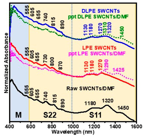 The S11 area of the DLPE SWCNTs absorption spectrum was further altered by decreasing the peaks at 1270 nm and 1130 nm. As a result, two broad peaks can be seen at 1270–1320 nm and 1130–1180 nm. The S22 peaks in the DLPE SWCNTs have similar positions to those of raw SWCNTs/DMF dispersion. The absorption spectra in the precipitates (ppt LPE and ppt DLPE) demonstrated a close match one of raw SWCNTs/DMF, which can indicate the presence of the excluded SWCNTs from LPE SWCNTs and DLPE SWCNT dispersions.