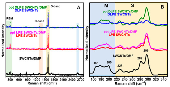 Raman spectroscopy samples were placed in quartz cuvettes, and spectra were taken at 671 nm excitation laser wavelength. For each sample, all measurements were taken with an exposure period of 10,000 ms and an integration time of 500 acquisitions. The Radial Breathing Mode (RBM) in Raman spectroscopy offers valuable information on the m- and s-SWCNTs ratios in the dispersion. Nonetheless, critical aspects should be considered in the RBM. First, the excitation wavelength overlaps differently with chirality and diameter size. While small-diameter nanotubes and m-SWCNTs are resonant at 533 nm excitation wavelengths, large-diameter nanotubes and s-SWCNTs are resonant at 785 nm excitation wavelengths. Different diameter sizes and electronic types of SWCNTs (m- and s-SWCNTs) are resonant with intermediate excitation wavelengths as long as 633 nm [50,51]. The excitation wavelength in the NS2 NanoSpectralyzer is limited to 671 nm.