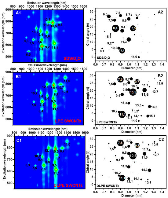 SDS, a non-selective dispersant, exhibits no apparent chirality preference in Figure 5(A1,A2) [23,75]. The SWCNTs/SDS dispersion included twelve primary semiconducting species with diameters ranging from 0.75 to 1.05 nm: (6,5), (7,5), (7,6), (8,4), (8,6), (8,7), (9,4), (9,7), (10,2), (10,5), (11,1), and (11,3). Significant differences were detected in the (n, m) and diameter size distributions of DLPE and LPE SWCNT samples. These mappings refute s-SWCNT bundle formation and corroborate the efficiency of poly(CEM11-b-EHA7) in individualizing s-SWCNTs. Figure 5(B1,B2) demonstrate that the LPE SWCNTs preferentially disperse five primary types with diameters ranging from 0.9 to 1.1 nm: (7,6), (9,7), (10,5), (11,1), and (11,6). Large-diameter tubes (d = 1–1.3 nm) were also found, such as (14,3) and (15,1). Alternatively, DLPE SWCNTs (Figure 5(C1,C2)) excluded (15,1) nanotubes from the extraction while maintaining the preference for (7,6), (9,7), (10,5), (11,1), (11,6), and (14,3).