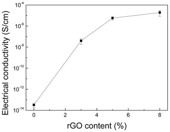“The electrical conductivity of cellulose/rGO composite aerogels can be adjusted by changing the content of rGO. The lowest amount of added rGO (3 wt%) is already above the percolation concentration and causes conductivity, as shown in Figure 4. The electrical conductivity is significantly enhanced with the increasing rGO content and reaches 1.9 × 10−5 S cm−1 in the case of the cellulose/rGO (8 wt%) aerogel. The electrical conductivity of cellulose/rGO confirms the success of the chemical reduction of GO to rGO and enables its application in vapour sensing.”