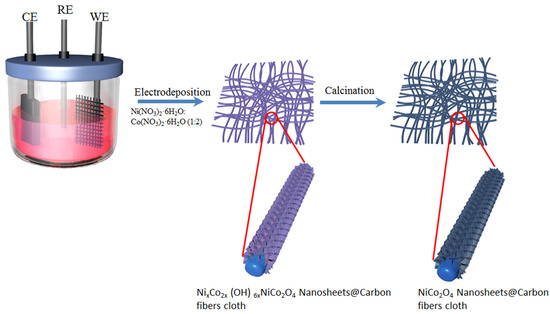 Our synthesis strategy consists of two steps, as illustrated in Figure 1: Firstly, the process involves co-electrodeposition of a bimetallic (Ni, Co) hydroxide precursor onto a carbon fiber cloth. Secondly, the resulting bimetallic (Ni, Co) hydroxides undergoes calcination to form nickel cobaltite. The electrolyte utilized in this process contains Ni2+, Co2+, and NO3− ions, maintaining a molar ratio of Ni2+ to Co2+ at 1:2. As an electric current passes through the electrolyte, the reduction of NO3− ions occurs at the cathode, producing OH− ions.
