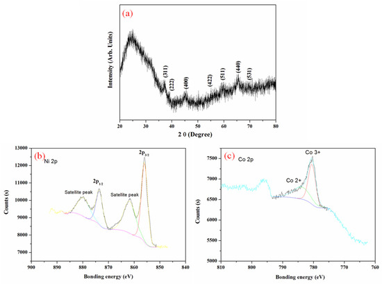 The crystal structural and phase characterizations were conducted using XRD and XPS studies. A broad peak at 24.9°, a typical peak of (002) plane of graphitic carbon, was observed and assigned to the diffraction patterns of the CF in Figure 2a and Figure S8. The other diffraction peaks at 2θ values of 18.9°, 36.7°, 38.4°, 44.6°, 55.4°, 59.1°, 65.0°, and 68.3° matched well to the (111), (311), (222), (400), (422), (511), (440), and (531) of spinel NiCo2O4 (JCPDF card no. 20-0781) in Figure 2a and Figure S9. No other peaks of nickel or cobalt compounds were observed, indicating that the synthesized nanosheets were only NiCo2O4. XPS spectra were measured and shown in Figure 2b,c. The Ni 2p spectrum was composed of two well-defined single peaks and two shakeup satellite peaks. The peaks at 856.6 and 874.6 eV were assigned to Ni 2p3/2 and Ni 2p1/2, respectively, whereas the peaks at 861.4 and 882.1 eV were two satellite peaks [18,23,24]. The Co 2p spectrum comprised one spin-orbit doublet characteristics and one shakeup satellite peak. The main peaks around 780.4 eV belonged to Co3+, while the weak peaks at 781.85 eV corresponded to Co2+ [18,25]. The satellite peak was seated at approximately 796.2 eV. It indicated that the NiCo2O4 NS@CF composite contained Ni2+ and the electron couple of Co3+/Co2+.
