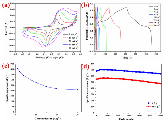 Figure 5b shows the CV curves of the asymmetric supercapacitor device at a scan rate from 5 to 100 mV s−1, where all the curves exhibited a similar shape even at a high scan rate of 100 mV s−1 and the redox peak currents increased with the increasing scan rate. It indicated that the charge–discharge property of the device was very fast. Moreover, the galvanostatic charge–discharge performance was measured at various current densities from 1 to 30 A g−1 in Figure 5c. The discharge curves were nearly linear while the whole galvanostatic charge–discharge curves were triangular in shape, suggesting a rapid I-V response and good electrochemical reversibility of the asymmetric device [28,29]. The specific capacitance of the asymmetric device was calculated based on the total mass of the electrode materials and plotted against current density in Figure 5d. The specific capacitances were 110, 102, 88, 74, 66, 62, and 57 F g−1 at 1, 2, 5, 10, 15, 20, and 30 A g−1, respectively. Furthermore, 52% of the initial specific capacitance was maintained even with a 30 times increase in current density.