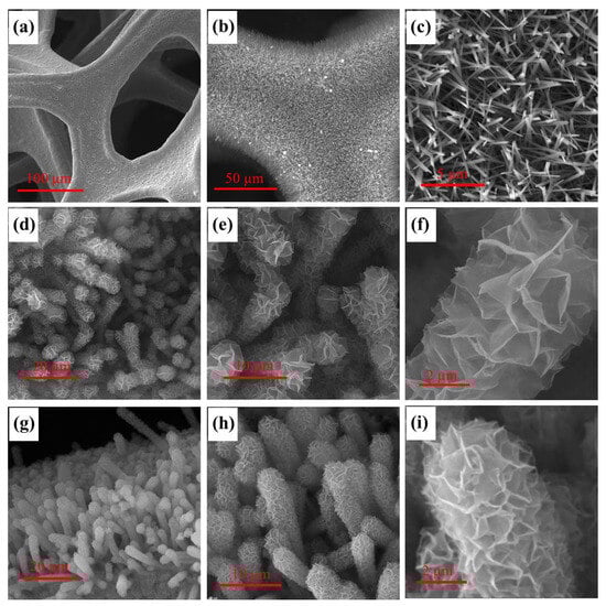 SEM image of CF (a), Cu(OH)2 nanowires (b,c), Ni(OH)2@Cu(OH)2-CF (d–f) and NiO@Cu2O-CF (g–i).