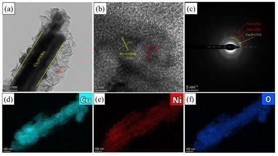 Further visualization of the morphology and structural attributes of NiO@Cu2O-CF was achieved through TEM analysis and element mapping. The fragmented NiO@Cu2O, which was scraped from the surface of the CF substrate, was characterized by TEM as shown in Figure 2a. Clearly, the nanowire (diameter ≈ 350 nm) is surrounded by an ultrathin shell featuring a folded structure. The evident interface between the nanowire and shells indicates a typical hierarchical core–shell structure. Figure 2b displays the high-resolution TEM result of the core–shell structural NiO@Cu2O. The lattice space of 0.25 nm can correspond to the (111) plane of Cu2O, and the 0.20 nm was indexed as the (200) plane of NiO. In addition, the selected area electron diffraction (SAED) result in Figure 2c revealed that the direction rings can correspond to (200), (220) planes of NiO and (111) planes of Cu2O. Moreover, Figure 2d–f demonstrate the distribution of the Cu, Ni and O elements on NiO@Cu2O.