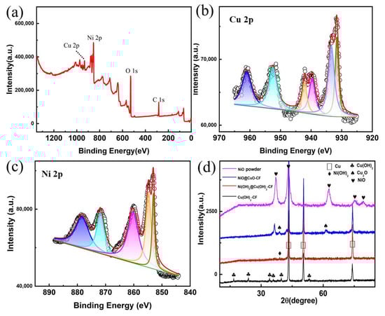 The chemical composition and crystalline structure analysis of NiO@Cu2O-CF: survey spectrum of XPS (a), Cu 2p spectrum of XPS (b), and Ni 2p spectrum of XPS (c); (d) the XRD patterns of as-synthesized materials.