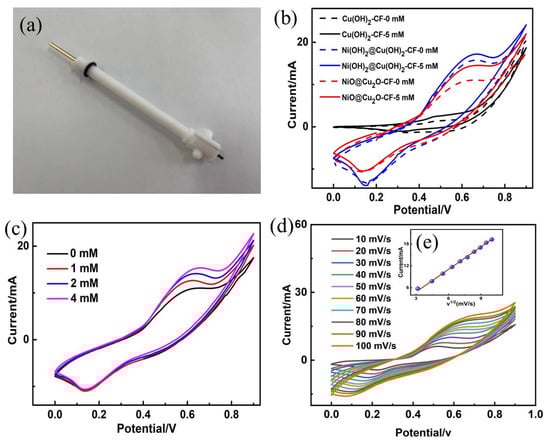 (a) The measurement setup of the working electrode; (b) CV curves (vs. Ag/AgCl) of Cu(OH)2-CF, Ni(OH)2@Cu(OH)2-CF and NiO@Cu2O-CF with 0 and 5.0 mM glucose in 0.1 M NaOH at 50 mV/s; (c) CVs (vs. Ag/AgCl) of NiO/Cu2O/CF with 0, 2.0 and 6.0 mM glucose; (d) the CV results that dependent on different scan rate (10–100 mV/s) in 0.1 M NaOH with 5.0 mM glucose; (e) inset image is the linear fitting of catalytic current increment vs. the square root of scan rate (ν1/2).