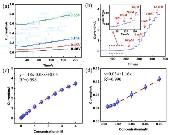 (a) Amperometric test curves of NiO@Cu2O-CF with continuous adding of glucose under different potentials: 0.40 V, 0.45 V, 0.50 V and 0.55 V; (b) amperometric titration experiment of NiO@Cu2O-CF at 0.45 V with 0.005–4.5 mM glucose, and the inset is the i–t curve in low glucose concentrations; (c) the quadratic polynomial fitting calibration line of the sensor; (d) the linear fitting calibration line of the sensor.