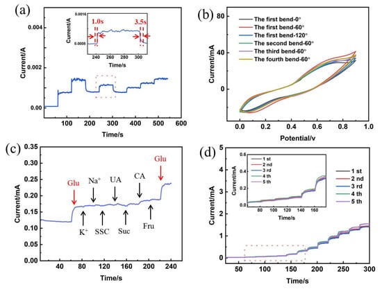 Additionally, as well as sensitivity, the response–recovery behavior, anti-interference performance, reproducibility and stability also make a great difference in evaluating the electrochemical catalytic ability for an efficient sensor. Figure 6a recorded the response–recovery ability of NiO@Cu2O-CF when the glucose was increased and diluted. At first, the current increased sharply when the glucose solution was dropped into the electrochemical cell. Then, the glucose was diluted by adding NaOH solution and the catalytic current decreased. From the inset image of Figure 6a, it took about 1.0 s to reach a steady-state value in the reaction cell, and it recovered to the base line in about 3.5 s. This confirms that the NiO@Cu2O-CF possesses fast response and recovery characteristics in sensing glucose. In addition, the effect of the deformed electrode was detected by bending the electrode from 0° to 120°. According to the result shown in Figure 6b, there was no significant difference for the CV in the NaOH solution with 4 mM glucose, suggesting the good anti-bending performance of the as-constructed electrode.