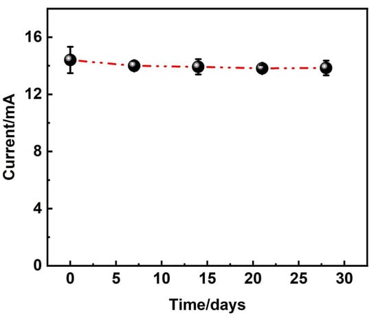 Selectivity is an essential ability for NiO@Cu2O-CF in practical application as an electrochemical sensor. As shown in Figure 6c, the interferences, such as KCl, NaCl, sodium citrate, urea, sucrose, citric acid and fructose, were added to the electrochemical cell in sequence. The concentration of the added interference was 100 µM. Compared to adding glucose, there was no significant current response with injecting those substances into the electrochemical cell. This indicates that the NiO@Cu2O-CF electrode possesses excellent selectivity for glucose determination. To evaluate the reproducibility of NiO@Cu2O-CF, we carried out an amperometry experiment on five electrodes fabricated by the same process. As shown by Figure 6d, almost all the electrodes respond with a similar current change with the glucose concentration range being 0.04–3.0 mM. The inset image is the results at a low glucose concentration range (0.04–0.4 mM). For evaluating the long-term stability of NiO@Cu2O-CF, cyclic voltammetry test was carried out on the same electrode in an electrochemical cell containing 5 mM glucose over 30 days (Figure 7). The relative standard deviation (RSD) of the current was calculated as 1.5% with 30 days, which demonstrated that the as-synthesized sensor presented outstanding long-term stability.