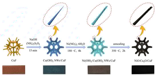 To further enhance the electro-catalytic property of metal-oxide-based sensitive materials, preparing a three-dimensional multilayer structure is an effective approach [,,]. In order to construct hierarchically sensitive materials, using copper foam (CF) as a substrate is an appropriate candidate. Furthermore, to increase the load of sensitive materials on a limited surface, designing a core-shell nano-structure is an excellent solution. Therefore, using nickel oxide and copper oxide to construct a core–shell structure on 3D copper foam and form a multicomponent hierarchical sensitive material could be a promising approach. It will have the advantages of a large specific surface area, efficient ion diffusion and electron transfer path.