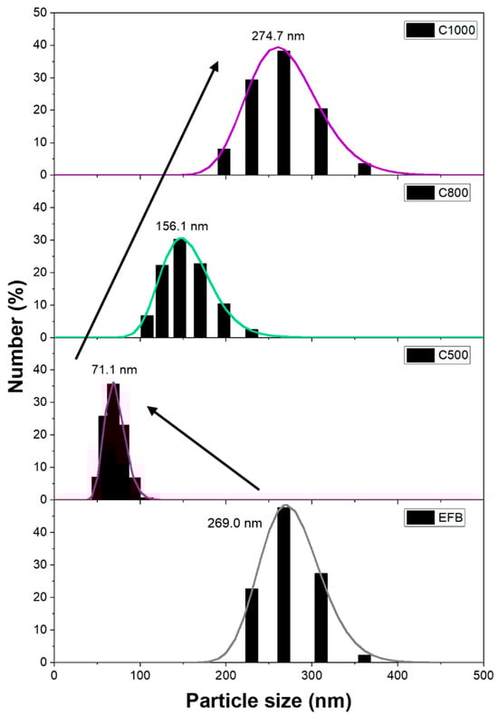 The particle size distribution, as seen in Figure 1, shows unimodal lognormal distributions with average particle sizes at 269.0, 71.1, 156.1, and 274.7 nm for EFB, C500, C800, and C1000, respectively. In comparison, particle size dropped significantly from untreated EFB to C500, followed by a gradual increase. These changes illustrate different steps inside the pyrolysis process. The first step includes the loss of moisture, which explains the decrease in size from 269.0 nm to 71.1 nm. The increase from C500 to C800 and C1000 is a result of prolonged exposure to heat. As the target pyrolysis temperature increases (from 500 °C to 800 °C and 1000 °C), the total time required to reach the final temperature increases because the heating progresses gradually at a fixed rate (3 °C/min). Thus, the samples spend more time under extreme heat. This extended heating duration influences biomass’s overall thermal decomposition behavior, particularly the water loss and the subsequent structural transformation of carbon materials. The prolonged exposure to heat promotes structural rearrangements, and amorphous carbon begins to transform into more ordered, graphitic domains, accompanied by eliminating residual heteroatoms and forming sp2-bonded carbon rings. This process, observed particularly at 1000 °C, contributes to the growth of nano-crystalline graphite with a higher degree of order, as evidenced by the Raman spectroscopy results. It has been reported that longer exposure to heat can influence both nucleation and agglomeration processes. Extended exposure can lead to the formation of more nucleated particles. The growth in particle size is largely driven by accelerated agglomeration. At high temperatures, the role of nucleation diminishes, and agglomeration becomes the dominant factor in particle growth [24].