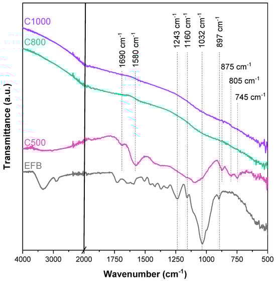 After pyrolysis at 500 °C, a significant change to the shape of the FTIR spectra was observed, signaling changes in structure and functional bonds. One of the most notable changes was the disappearance of the O−H stretching peak, which suggests that dehydration of the fibers occurred during this stage of thermal treatment [31]. This is consistent with the known decomposition behavior of lignocellulosic biomass, where both cellulose and hemicellulose undergo carbonization as they decompose, beginning at approximately 200 °C for hemicellulose and 327 °C for cellulose [38]. Additionally, new peaks emerged in the FTIR spectra, namely at 1690 cm−1 (C=O stretching for phenolic esters), 1580 cm−1 (aromatic C=C stretching), along with triple peaks at 875, 805, and 745 cm−1 (C−H bending for aromatic out-of-plane deformation), which indicates the formation of aromatic compounds. These observations confirm that the pyrolysis process at 500 °C facilitated significant carbonization, including the development of condensed aromatic compounds [37].