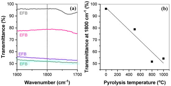 (a) The difference in baseline of EFB fiber and biochar samples at 1900–1700 cm−1. (b) The percent transmittance at 1800 cm−1 with increasing pyrolysis temperatures.