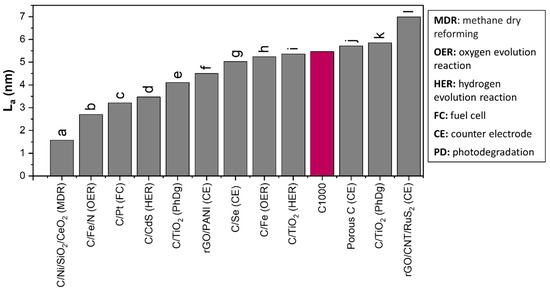 Additional modifications may be necessary to balance defect density and conductivity and optimize the utility of C1000 biochar. Potential strategies include doping with heteroatoms, exfoliation, oxidation, surface functionalization, and physical and chemical activation [49,55,56]. Additionally, further modifications to give ferromagnetic properties have also been explored, as demonstrated by Lyu et al. (2024) through metal-nitrogen doping, highlighting the versatility of carbon-based materials [56]. Alternatively, the current properties of C1000 make it a promising candidate for use as a catalyst support. Its high surface area and defect-rich structure could enhance the performance of supported catalysts in various applications, such as solar cell counter electrodes, electrocatalysts, and photocatalysts, as demonstrated in Figure 6, which compares the crystallite size of our C1000 biochar with other carbon-based catalyst supports [53,57,58,59,60,61,62,63,64,65,66,67]. All the cited reports utilize carbonaceous materials that have wide overlapping D and G peaks, like the samples discussed in this study. This comparison highlights the competitive edge of C1000 biochar in terms of its nanoscale structure, suggesting potential for integration into advanced catalytic systems. Further research and optimization could pave the way for its application in sustainable and high-performance catalytic processes. It should be noted that the presented La is only a rough estimate and is used here to better compare with other studies.