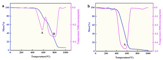 First, the product is to be dried in an incubator at 100 °C for 12 h. Subsequently, the stability of the CNT prepared in Li-Ca chloride salt and CS in the Li-Ca-K system is to be tested using TGA at a heating rate of 10 °C/min in an atmospheric environment. The results are presented in Figure 8. DTG refers to the rate of weight loss per unit of time, with various peaks on the DTG curve corresponding to each weight change stage on the TG curve. The peaks at points A and B represent distinct weight change stages near these points. In comparison with the mass loss of CS starting at 400 °C, it is observed that CNT still exhibits good stability at temperatures exceeding 450 °C. The TGA diagram in the Li-Ca chloride system has two weight change points. Due to the previous EDS data, it can be guessed that CaCO3 is generated in this process, which delays the rate of product quality decline. Upon completion of heating, a little residue remains in the corundum crucible in the Li-Ca chloride system. As mentioned earlier, this indicates that the carbon material is mainly composed of carbon with oxygen-containing functional groups and a little calcium.