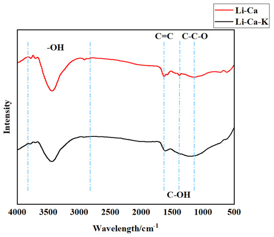 The CSs prepared in the Li-Ca-K chloride system and CNTs prepared in the Li-Ca chloride system were analyzed using infrared spectroscopy. The results of the analysis are shown in Figure 9. The peak observed at 1110 cm−1 corresponds to the stretching vibration of the C-C-O functional group, indicating the presence of oxygen in the EDS product mentioned earlier and confirming our speculation about the existence of an oxygen-containing functional group. Additionally, a peak at around 1600 cm−1 corresponding to C = C, as an unsaturated hydrocarbon, could be attributed to the excellent conductivity of CNTs and CSs. Between 2700 cm−1 and 3700 cm−1, there is a large peak and many small peaks, which are related to the vibration of C-OH. The H here may come from long-term immersion in water, so a small part of the H in the water combines with the oxygen-containing functional group of the carbon material to form -OH. In addition, there is also a vibration peak at 1383 cm−1, representing the C-OH functional group [34].