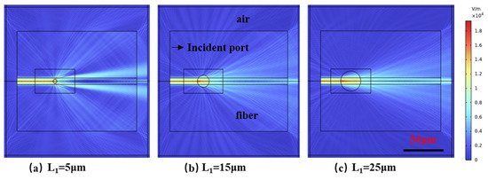We use the COMSOL6.2 simulation software to analyze the problem in Figure 1a, mainly analyzing the TE wave [28] in detail. In this instance, the orientation of the Ey component is aligned with the axial direction of the micro-hole and is perpendicular to the working surface. Using 1550 nm light wave excitation, the distribution of the Ey component of the guided wave passing through micro-holes with diameters of 5 µm, 15 µm, and 25 µm is simulated, and the simulation results are shown in Figure 2. The model domain consists of the optical fiber and the surrounding air, with the absorption boundary defined by the widely used anisotropic perfect matching layer (APML). The APML is a numerical technique employed to simulate an open boundary in wave propagation problems. Unlike isotropic layers, the anisotropic nature of the APML allows it to more effectively absorb incident waves in different directions, minimizing reflections at the boundaries. This makes the APML particularly suitable for problems involving complex geometries and varying material properties, such as the present study. Since this waveguide supports only the lowest-order mode, its mode field distribution can be readily calculated using the effective refractive index method. The effective refractive index method is a widely used approach for the approximation of the propagation characteristics of waveguides, particularly when only the fundamental mode is considered. In this method, the waveguide is treated as an effective homogeneous medium with an ‘effective’ refractive index, which is derived from the physical properties of the waveguide, such as its geometry and the refractive indices of the core and cladding materials. This simplification allows for the efficient calculation of the mode field distribution without solving the full waveguide mode equation. In order to examine the scattering effects produced by the micro-hole on the guided wave, as well as the progression of the transverse electric field distribution along the direction of propagation, the optical fiber is configured to a length of 200 µm. The length L2 of Cavity2 is specified as 100 µm, and the refractive index of the material filling the micro-hole is established at 1.