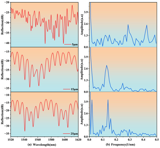 As shown in Figure 3, when the aperture is 5 µm, both the reflection spectrum and the frequency spectrum appear chaotic, with no distinct interference fringes present, highlighting the more pronounced scattering effect. When the aperture increases to 15 μm, the reflection spectrum begins to show clearer interference fringes, mainly including a fast-changing interference fringe from Cavity2 (named as the sensing cavity) and a slowly changing interference fringe from Cavity1. Since the length of Cavity2 is much longer than that of Cavity1, the interference fringes generated by Cavity1 only serve as the envelopes of the interference fringes generated by Cavity2. However, it can be observed from its spectrum that there is only one characteristic peak, so the interference fringes are mainly modulated by Cavity2 at this time. This is also expected in subsequent experiments. When the aperture is further increased to 25 μm, the resonance effect is more obvious, and two characteristic peaks appear in its spectrum; the first peak corresponds to Cavity1, and the second peak corresponds to Cavity2. This is because the transmittance and aperture of the micropores in the fiber core increase; more light is recoupled into Cavity2, and Cavity1 and resonates. Therefore, the interference fringes are mainly affected by the combined effects of Cavity1 and Cavity2.