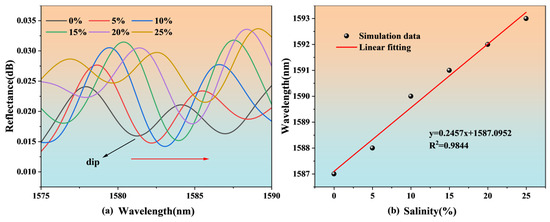 As can be seen from Figure 4a, within the salinity range of 0% to 25%, as the salinity increases, the sensor’s reflection spectrum shifts toward the long-wave direction. The trough near the wavelength of 1587 nm is selected as the observation point dip. A linear fit is performed on the change in dip, and the result is shown in Figure 4b. The linearity is 0.9844, which indicates a good linear relationship, and the sensitivity is 0.246 nm/%.