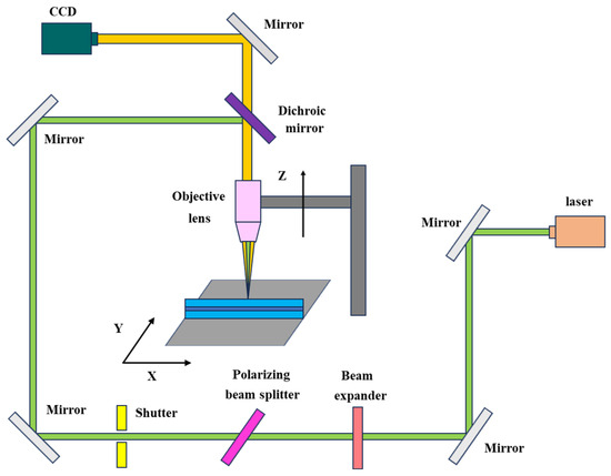 In this work, micro-hole processing was performed on an ordinary single-mode optical fiber (SMF-28Ultra, Corning Incorporated, New York, NY, USA), and a refractive index matching oil (VH-521, Shanghai Xianhu Communication Equipment Co., Ltd., Shanghai, China) with a refractive index of 1.47 was used as an auxiliary liquid. The fiber laser processing system used in this study is shown in Figure 5. The femtosecond laser system is a commercial mode-locked fiber laser (FemtoYL-40, Wuhan Yangtze Soton Laser Co., Ltd., Wuhan, China), which produces 300 fs pulses (FWHM) at a wavelength of 515 nm, and the pulse repetition rate can be adjusted from 25 kHz to 5 MHz. The laser passes through a beam expander, a polarization beam splitter, and an aperture before entering a 10× objective lens (M Plan Apo SL, Mitutoyo Corporation, Kawasaki, Kanagawa, Japan). The beam expander increases the size of the laser beam, ensuring that it is properly aligned with the optical components. The polarization beam splitter separates the incident light into two orthogonal polarization components, allowing the selective control of the polarization state of the beam. The aperture is used to limit the size of the beam, ensuring that only the desired portion of the beam enters the objective lens, thereby improving the focus and precision of the optical measurements. The fiber was fixed by a fixture, and the processing trajectory and processing speed were controlled by programming the 3D micro-positioning platform. A CCD camera was used to align the sample and obtain a real-time view of the laser processing.