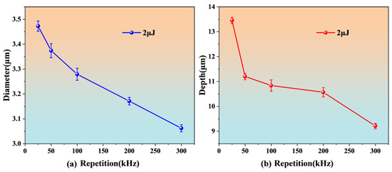 The effect of the repetition rate on micro-hole processing on the surfaces of optical fibers: (a) diameter, (b) depth.