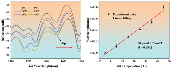 The spectra corresponding to the sensor changes at different temperatures are shown in Figure 12. As the temperature increases, the interference spectrum gradually redshifts, and the dip near the wavelength of 1603 nm is selected as the observation point dip. The change in dip is linearly fitted, and the result is shown in Figure 12b. The linearity is 0.9842, which indicates a good linear relationship. The sensitivity is 0.015 nm/°C. The temperature sensitivity of this sensor is low [19,29], which means that temperature crosstalk can be ignored in different types of salinity sensing. Similarly, based on the temperature sensitivity of 0.015 nm/°C and the same noise level of approximately 0.05 nm, the estimated temperature resolution is 3.33 °C.