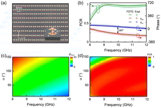 To verify our concept, we start to design high-efficiency meta-atoms as the building block of the desired metadevice operating in the microwave regime. In a total reflection configuration, we propose a metal-insulator-metal (MIM) typed microstructure satisfying the mirror symmetry, which consists of a curved H-shaped microstructure as the top layer, a 3 mm-thick F4B dielectric layer () in the middle, and a continuous copper film as the bottom layer. Numerical optimization is adopted to determine the structural parameters of the desired meta-atoms that satisfy the aforementioned theoretical criterion. Figure 2a shows one example of such meta-atoms in a periodic array with the following structural parameters: r = 3 mm, w = 0.85 mm, α = 120°, and p = 8 mm. Figure 2b illustrates the spectra of the reflection phase and PCR of such meta-atoms obtained by numerical simulations and experimental measurements. It is noted that the phase difference between and can be maintained around 180° within the whole frequency window. Here, the PCR of the meta-atoms, defined as according to the previous Jones’ matrix analysis, reaches approximately 100% in the frequency range of 9~12 GHz. The measurement results are in good agreement with the simulation results, verifying the high performance of such a metadevice. Furthermore, as the opening angle of the curved H-shaped microstructure increases, the resonant phase of such meta-atoms can be continuously adjusted within a large modulation range, as shown in Figure 2c. Meanwhile, PCRs of the meta-atoms with different still remain nearly 100% across almost the entire bandwidth, as shown in Figure 2d. These results indicate that we have built up the database of the high-performance composite meta-atoms for constructing the desired spin-delinked bifunctional metasurface according to Equation (3).