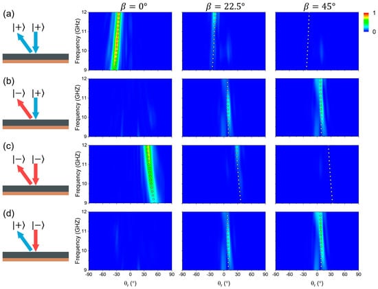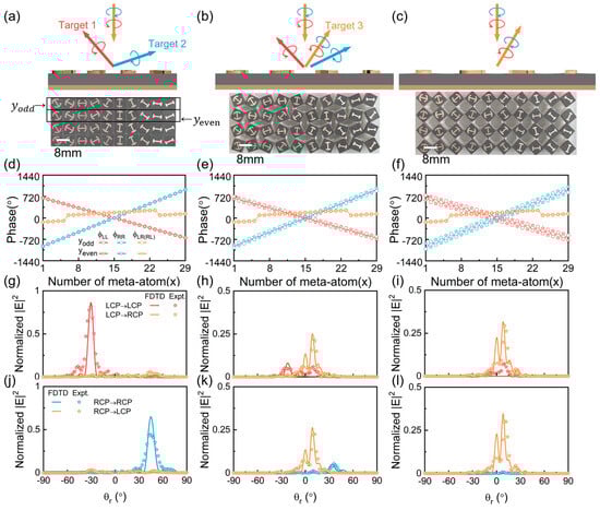 where is the wavevector of the EM wave in free space. According to Equation (3) and Equation (5), we can obtain the distributions of the desired resonant phase and PB phase , respectively, encoded by the meta-atoms at each local position of (x, y). Finally, we can determine the full parameters, including opening angle (x, y) and orientation angle , of each meta-atom on the composite-phase metasurface based on the relationship of and (see Figure S2 of Supplementary Materials). The reflection phase distributions of the metasurface for two anomalous modes and one normal mode based on the Equation (5) are shown in Figure 3d. Due to the high PCRs of the adopted meta-atoms, the normal mode of the metasurface at the initial state () is suppressed. Therefore, the incident LCP and RCP waves are almost completely deflected into the two pre-designed anomalous reflection channels, as shown in Figure 3a.