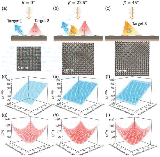 where is the corresponding anomalous reflection angle for RCP illumination, and F = 85 mm is the target focal length for LCP illumination. According to Equations (3) and (6) and the relationship of and , we can obtain the distributions of the two characteristic parameters (θ, α) of the meta-atoms at the position of (x, y) (see Figure S9, Supplementary Materials). Such device consists of 29 × 29 elements with a total size of in the initial state (β = 0°). Figure 5d,g depict the distributions of and in the undeployed state (β = 0°), showing linear and parabolic profiles, respectively. As the kirigami metasurface transforms to the states of β = 22.5° and β = 45°, the encoded phases and can be degenerated into two phase planes with the same profiles but a constant phase difference of 90° and 180°, respectively, as shown in Figure 5e,h and Figure 5f,i. According to the previous discussion, the interference effect between them suppresses the anomalous modes and releases the normal mode, as schematically shown in Figure 5b. Since only the resonant phase distribution () is responsible for generating the spin-independent normal mode, and thus is immune to the variation of meta-atoms’ orientation during the transformation process. In the special state of β = 45°, the metadevice only permits the existence of the normal mode, which corresponds to the tilted beam focusing effect as shown in Figure 5c, because of the destructive interference condition for the anomalous modes.