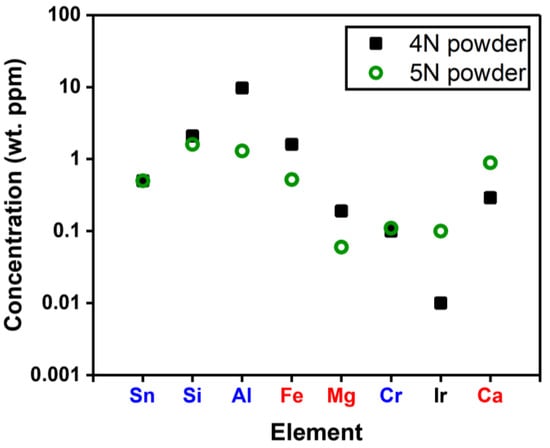 Figure 2 compares the majority of impurities of 4N and 5N β-Ga2O3 powders measured via GDMS. Donor-like impurities (Sn, Si, Al, and Cr), marked in blue, are primarily substituted into Ga sites, acting as donors [32,36]. The Al in 4N powder, present in high concentrations, might form a ternary solid solution and lead to oxygen vacancies in β-Ga2O3 [37]. While an appropriate concentration of a donor such as Si can enhance electron transport, excessive Si leads to segregation and polycrystal formation [38]. Due to the similar atomic radii of Cr (0.062 nm) and Ga (0.062 nm), Cr impurities do not significantly affect the bandgap or structural deformation of β-Ga2O3. However, changes in photoluminescence in the visible to near-infrared range have been observed [39].