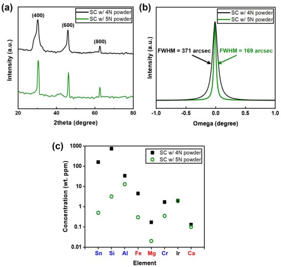 Figure 3a,b show the XRD spectra of the β-Ga2O3 single crystals (SC) grown from 4N and 5N powders, respectively. As the (100) planes of β-Ga2O3 were the primary growth planes in the EFG process, the surfaces of all grown β-Ga2O3 single crystals were also the (100) plane, as shown in Figure 3a. The full width at half maximum (FWHM) of the (400) diffraction peak was 371 arcsec for crystals grown from 4N powder and 169 arcsec for those grown from 5N powder, as shown in Figure 3b. Hence, the crystal quality was superior for crystals grown from 5N powder. Figure 3c compares the concentrations of impurities in β-Ga2O3 crystals grown from 4N and 5N powders. The Sn dopant was more volatile in high-purity 5N Ga2O3 powder than in lower-purity 4N Ga2O3 powder. As Sn starts to evaporate at very high temperatures (>900 °C), high concentrations of Sn were distributed in the upper region of the Ga2O3 melt during crystal growth, while concentrations are lower in the lower region of the melt [43]. Additionally, Ga vacancies formed at high temperatures can readily capture Sn atoms, resulting in the formation of an energetically stable complex (VGaSnGa, 1.63 eV), allowing Sn to either diffuse within the (100) β-Ga2O3 crystal or remain adsorbed on its surface [44]. The concentrations of Si and Al were significantly higher than expected. These impurities likely originated from silica, alumina, and other experimental equipment components [25]. In particular, the Ir crucible and alumina rod used in the EFG process are major sources of impurities. These impurities include elements such as Si, Al, Fe, Mg, Cr, Ir, and Ca, and in single crystals grown using 4N powder, the concentrations of Al and Si can exceed 10 wt. ppm. Additionally, the concentrations of element impurities like Si and Fe may increase due to the surrounding environment or source material during the single-crystal growth process. Therefore, the choice of starting material purity and experimental equipment is crucial for improving the quality of (100) β-Ga2O3 crystals.