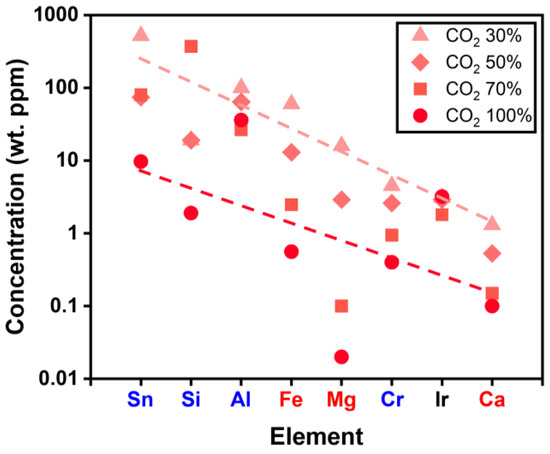 Impurity concentration of Ga2O3 pre-melt after the power heating process with various CO2 gas ratios (30–100%), measured by GDMS.