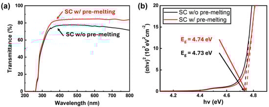 (a) UV/vis transmittance spectra of β-Ga2O3 single crystals grown with and without pre-melting and (b) the Tauc plot for determining the optical bandgap.