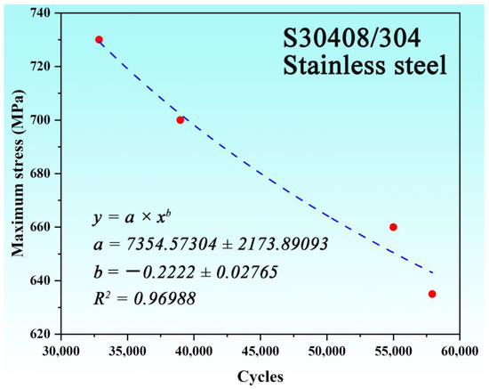 The results of the fatigue tests are shown in Table 3. As the loading stress level gradually increases, the fatigue life of the S30408 stainless steel smooth specimen continues to decline. Based on the low cycle fatigue test parameters controlled by four stress levels and the data of the four low cycle fatigue tests, the maximum stress and fatigue life discrete points were fitted to obtain the stress–life curve, as shown in Figure 2. The quantitative relationship between the maximum stress (σmax) and fatigue life (Nf) of the smooth S30408 specimens is as follows: