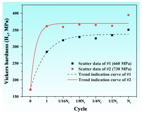 The main micro-defects caused by fatigue are dislocations, which are always associated with the hardness of the material [26]. The statistical results of the variation in the Vickers hardness with different cycles of the unbroken fatigue samples under 660 MPa and 730 MPa stress fatigue tests are shown in Figure 3. It can clearly be seen from the figure that with the increase in cycles, the hardness of these fatigue samples shows an upward trend, and the increase is mainly concentrated after one cycle. In comparison, the hardness of the fatigue sample under 730 MPa stress is higher than that of the sample under 660 MPa stress at each cycle state.