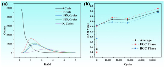 We conducted a statistical analysis on the KAM values of fatigue samples with different cycles under the 660 MPa stress condition, and the results are shown in Figure 6. Due to severe deformation of the internal grains of the material during the fatigue test, the analytical results of EBSD were not ideal. However, it can still be seen in Figure 6a that as the number of cycles increases, the overall stress inside the grains of the fatigue sample increases significantly, which is mainly due to the contribution of dislocations. And Figure 6b also clearly shows the trend of the KAM value increasing with the increase in cycle times, mainly concentrated after one cycle, which is consistent with the aforementioned trend of the hardness change.